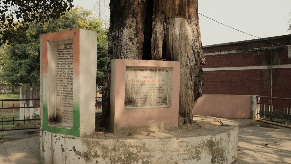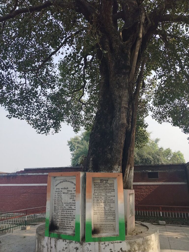 During that war, Queen Talaash Kunwari of Amodha fought pitch battles with the British. After her death, her commander Avadhoot Singh continued the fight. Thousands of fighters joined him in a decisive battle on 6th March 1858 where many British soldiers were killed. The immediate trigger for this brutality could have been the assassination of General Keele (Verification needed). Any revolutionary caught by the British was hanged on this tree and a nearby mango tree and were left there as an example.