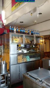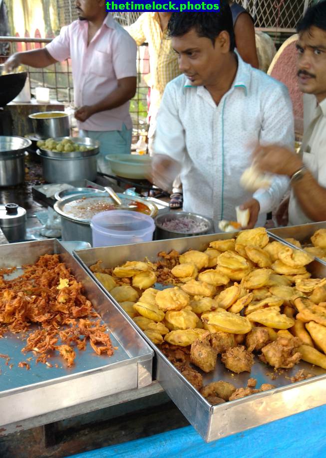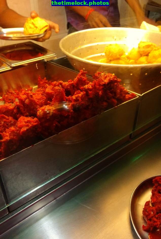 One can watch in amazement as food flies off the trays. There is a frantic activity at the huge frying kadhai. Popular items here are the fried pakoras or bhajjis as they are locally known. The specially fav item is the onion pakora or kandi bhajji as people fondly call it. If you are lucky, you might get your hands on the green chilli pakoda. But that one is rare.