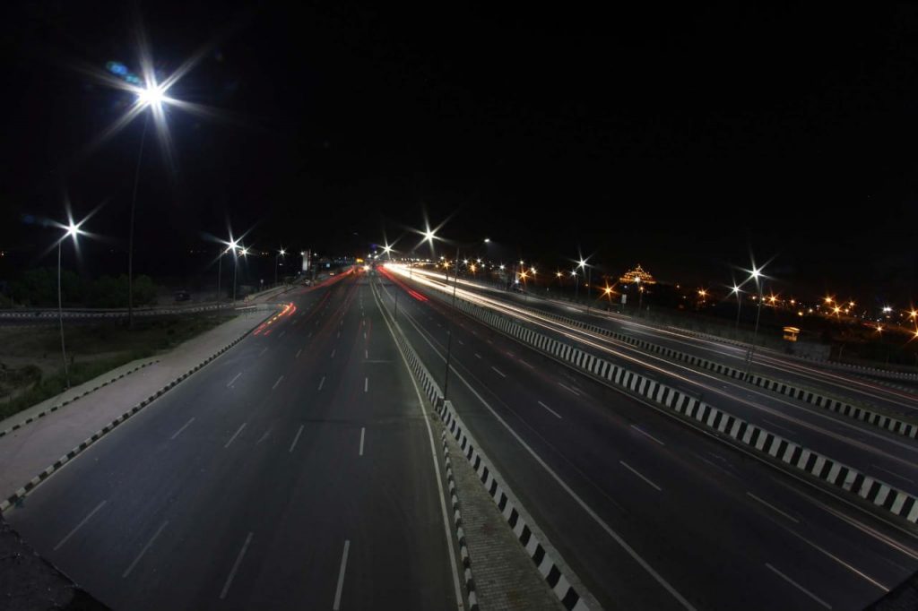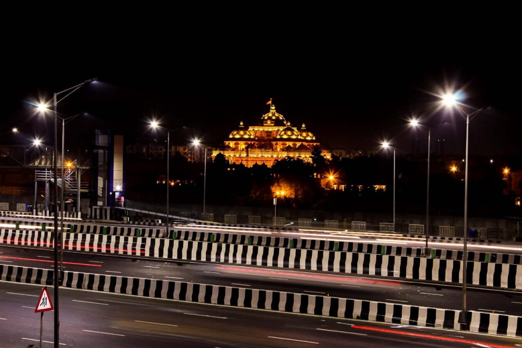 The next stopover is the junction where Delhi-Meerut Expressway crossed below the Noida link road. This road has a metro line running parallel and gives a majestic view of the Akshardham Temple lit in golden hues.