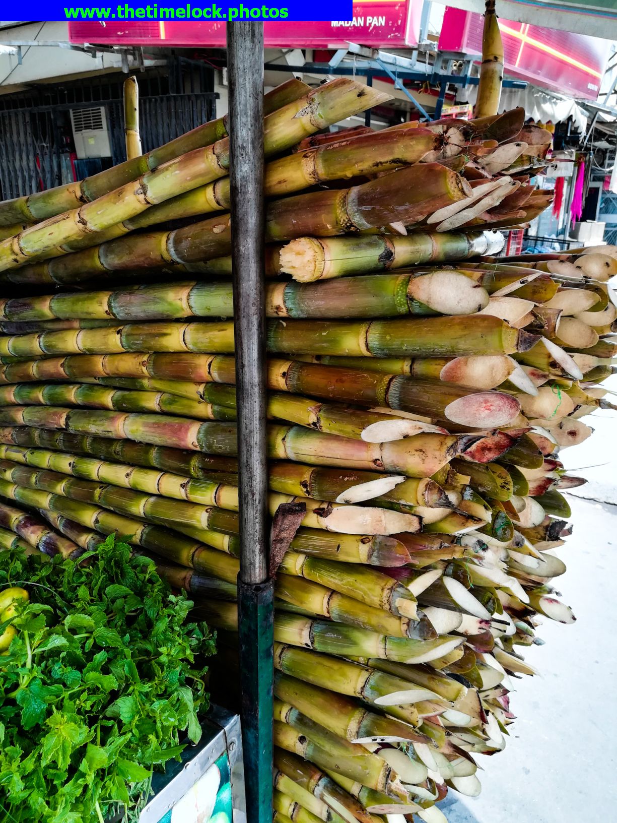 The cane is crushed under a pair of rollers. Mint and lime is added during the crushing process. A dash of salt and ice is a really refreshing drink.